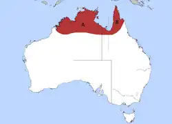 C'est un oiseau résident commun de la savane sèche dans le nord de l'Australie, du Kimberley, le Top End, le golfe de Carpentarie et la partie méridionale de la péninsule du cap York, jusqu'à Chillagoe à l'est mais toujours près de l'eau.