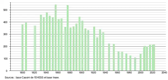 L'évolution du nombre d'habitants est connue à travers les recensements de la population effectués dans la commune depuis 1800. Pour les communes de moins de 10 000 habitants, une enquête de recensement portant sur toute la population est réalisée tous les cinq ans, les populations de référence des années intermédiaires étant quant à elles estimées par interpolation ou extrapolation[17]. Pour la commune, le premier recensement exhaustif entrant dans le cadre du nouveau dispositif a été réalisé en 2005[18].