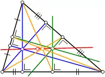 La droite d'Euler est définie par l’alignement du centre de gravité d'un triangle, son orthocentre et le centre du cercle circonscrit.