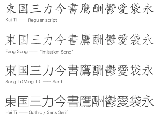 Trois familles de polices forment les bases de la typographie chinoise moderne :