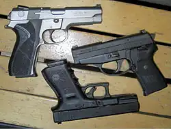 - Années 1980-1990 : pistolets en 9 mm Luger comme le Beretta 92, le Glock 17, le HK P7 ou le SIG P225. Smith & Wesson obtint plusieurs contrats pour la fourniture de S&W Model 459 et S&W Model 5903/5904/5906. Les Special Weapons and Tactics Teams des Los Angeles Police Department et San Francisco Police Department adoptèrent des modèles en .45 ACP sous la forme des Colt Goverment et Sig-Sauer P220-1
