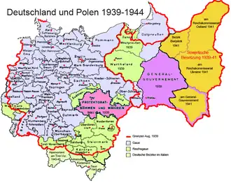 Les territoires polonais contrôlés par le Reich sont divisés par décrets en deux ensembles dans le courant du mois d'octobre 1939. À compter du 1er novembre 1939, le décret du 8 octobre établit deux Reichsgau, un à Dantzig, un à Posen, tandis que les Gaue de Prusse-Orientale et de Haute-Silésie incorporent des districts polonais voisins[10].