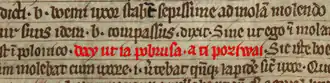 Le terme « Pologne » (en polonais : Polska) ou « Polonais » (en polonais : Polacy) dérive du terme indo-européen pole, pele que l'on retrouve dans le latin populaire campania désignant un paysage de champs ouverts et qui a aussi donné la Campanie, la Campine, la Champagne ou la Westphalie[13]. D'ailleurs l'ancienne Pologne médiévale était elle-même parfois désignée ainsi : « Inter Alpes Huniae et Oceanum est Polonia, sic dicta in eorum idiomate quasi Campania » (« Entre les Alpes de Hunia et l'océan se trouve la Pologne, ainsi appelée dans son idiome comme la Campanie »), écrit Gervais de Tilbury en 1211.