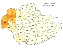 En 1926, la RSS d'Ukraine, à l'est du Zbroutch, comptait 476 435 Polonais, soit 1,6 % de sa population totale. Parmi eux, 48,8 % indiquaient avoir l'ukrainien comme langue maternelle[6]. Un district autonome polonais, la Marchlewszczyzna, exista de 1925 à 1936 au sein de l'Ukraine soviétique ; mais il fut dissous et ses habitants polonais assassinés ou déportés au Kazakhstan. En fait, l'ancien district autonome polonais est aujourd'hui le territoire où la concentration de Polonais ethniques en Ukraine est la plus importante. La population de Dovbych, son ancienne capitales, est aujourd'hui encore majoritairement polonaise et catholique.