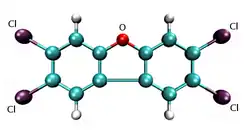 Dans la molécule représentée ci-dessus, 4 atomes d'hydrogène sont substitués par des atomes de chlore. D'une manière générale, dans les molécules de Polychlorodibenzo-furane, il peut y avoir 2 à 8 substitutions.