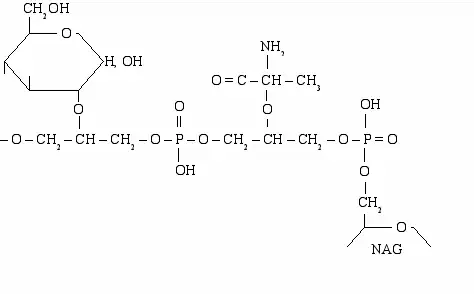 Le polyglycérol phosphate est un exemple d’acide téichoïque présent dans la paroi bactérienne. Présent avec le peptidoglycane des bactéries à Gram positif par le carbone #6 de l'acide N-acétyl-muramique.