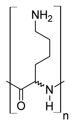 La polylysine est un polymère organique composé de lysine. Cette dernière est un acide aminé qui présente un premier groupe amine en position α et un second en position ε, de sorte qu'on distingue l'α-polylysine de l'ε-polylysine. Il existe deux énantiomères de la lysine : la L-lysine, qui un acide aminé protéinogène, et la D-lysine, qui n'est pas présente naturellement dans les protéines. On distingue par conséquent deux α-polylysines : la poly-L-lysine (PLL) et de la poly-D-lysine (PDL)[1] ; et deux ε-polylysines : l'ε-poly-L-lysine (EPL), qui est généralement produite sous la forme d'un homopolymère d'environ 25 à 30 résidus de L-lysine[2], et de l'ε-poly-D-lysine (EPD).