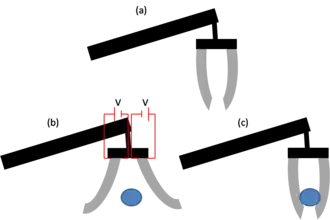 Les polymères électroactifs (PEA) (en anglais : electroactive polymers (EAP)), sont des polymères dont la forme ou la taille changent lorsqu'ils sont stimulés par un champ électrique. L'utilisation principale de ce type de matériau est la fabrication d'actionneurs[1],[2] et de capteurs[3]. Une propriété intéressante des EAP est qu'ils sont capables de grandes déformations, ainsi que de forces importantes. La plus grande partie des actionneurs actuels est fabriquée à partir de céramiques piézo-électriques. Ces matériaux sont certes capables de produire des forces très élevées, cependant leur domaine de déformation n'excède pas quelques pourcents. Durant les années 1990, il a été démontré que certains EAP sont capables d'une déformation de 380 %[1], ce qui est très grandement supérieur à n'importe quelle céramique utilisée actuellement. Une autre application des EAP est dans le développement de la robotique (robotique molle notamment), dans le développement de muscles artificiels. Le fonctionnement d'une pince en EAP est décrit dans la figure 1.