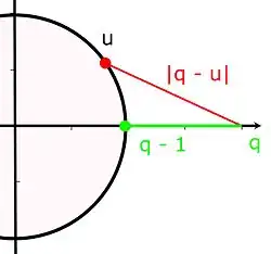 La fin de la démonstration quitte le dénombrement pour devenir géométrique. Pour tout n > 1, toute racine primitive n-ième de l'unité u vérifie la minoration |q – u| > q – 1 (illustrée par la figure de droite), qui permet de prouver que
