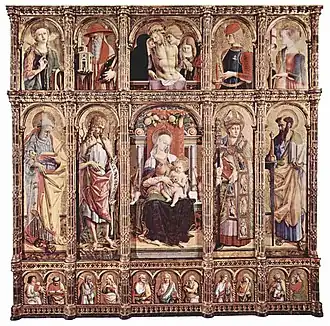 En opposition à la dispersion générale des œuvres de Crivelli dans les Marches, le polyptyque d'Ascoli, commandé par l'évêque Prospero Caffarelli, n'a pas été retiré de la cathédrale depuis son placement en 1473, restant intact tant au niveau des panneaux que du cadre[1],[2].