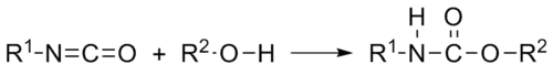On appelle uréthane, ou plus couramment « carbamate », tout composé produit par la réaction d'un isocyanate et d'un alcool conformément à la réaction suivante :