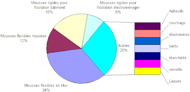 D'après une étude[2] de l'Ademe, l'emploi des polyuréthanes dans le monde se répartit de la façon suivante :