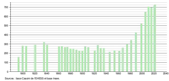 L'évolution du nombre d'habitants est connue à travers les recensements de la population effectués dans la commune depuis 1793. Pour les communes de moins de 10 000 habitants, une enquête de recensement portant sur toute la population est réalisée tous les cinq ans, les populations de référence des années intermédiaires étant quant à elles estimées par interpolation ou extrapolation[18]. Pour la commune, le premier recensement exhaustif entrant dans le cadre du nouveau dispositif a été réalisé en 2006[19].