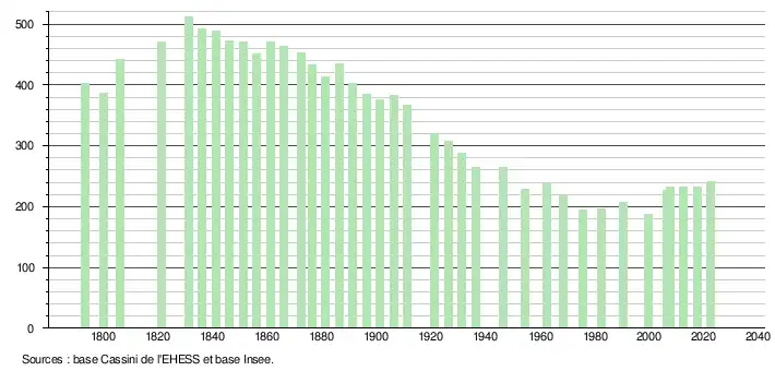 L'évolution du nombre d'habitants est connue à travers les recensements de la population effectués dans la commune depuis 1793. Pour les communes de moins de 10 000 habitants, une enquête de recensement portant sur toute la population est réalisée tous les cinq ans, les populations de référence des années intermédiaires étant quant à elles estimées par interpolation ou extrapolation[30]. Pour la commune, le premier recensement exhaustif entrant dans le cadre du nouveau dispositif a été réalisé en 2007[31].