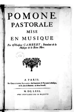 Pomone est une pastorale française en cinq actes et un prologue du compositeur Robert Cambert, sur un livret de Pierre Perrin[1] avec une chorégraphie de Pierre Beauchamp[2], créée le [3] pour l'inauguration de la salle du Jeu de paume dit de la Bouteille rue Mazarine.