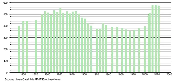 L'évolution du nombre d'habitants est connue à travers les recensements de la population effectués dans la commune depuis 1793. Pour les communes de moins de 10 000 habitants, une enquête de recensement portant sur toute la population est réalisée tous les cinq ans, les populations de référence des années intermédiaires étant quant à elles estimées par interpolation ou extrapolation[18]. Pour la commune, le premier recensement exhaustif entrant dans le cadre du nouveau dispositif a été réalisé en 2007[19].