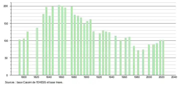 L'évolution du nombre d'habitants est connue à travers les recensements de la population effectués dans la commune depuis 1793. Pour les communes de moins de 10 000 habitants, une enquête de recensement portant sur toute la population est réalisée tous les cinq ans, les populations de référence des années intermédiaires étant quant à elles estimées par interpolation ou extrapolation[24]. Pour la commune, le premier recensement exhaustif entrant dans le cadre du nouveau dispositif a été réalisé en 2007[25].