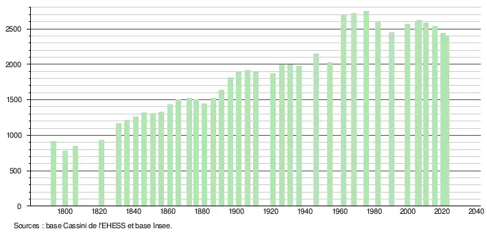 L'évolution du nombre d'habitants est connue à travers les recensements de la population effectués dans la commune depuis 1793. Pour les communes de moins de 10 000 habitants, une enquête de recensement portant sur toute la population est réalisée tous les cinq ans, les populations de référence des années intermédiaires étant quant à elles estimées par interpolation ou extrapolation[36]. Pour la commune, le premier recensement exhaustif entrant dans le cadre du nouveau dispositif a été réalisé en 2005[37].