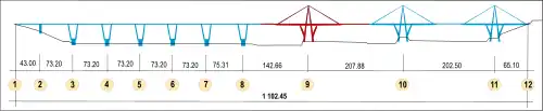 - un viaduc multi-haubané de 618,1 m de longueur, constitué de quatre travées supportées par trois pylônes portant chacun deux paires de haubans. Les portées de chacune des travées sont respectivement, de l'ouest vers l'est et mesurées entre axes de chaque pile, de 142,6 m, 207,9 m, 202,5 m et 65,10 m[1].