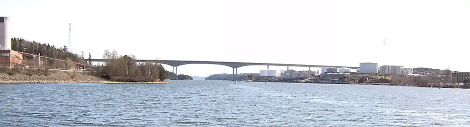 Le pont vu du sud-ouest. Dans le coin supérieur gauche, on devine la gare de Södertälje Sud. | ||