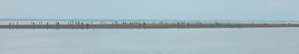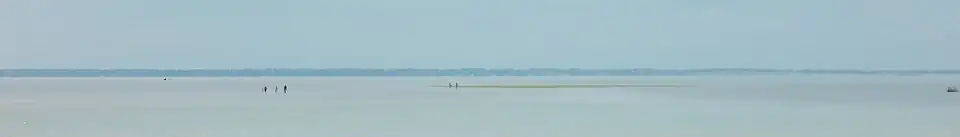 Le pont d'Yeu à marée basse, l'île d'Yeu est en vue au loin à gauche. | |