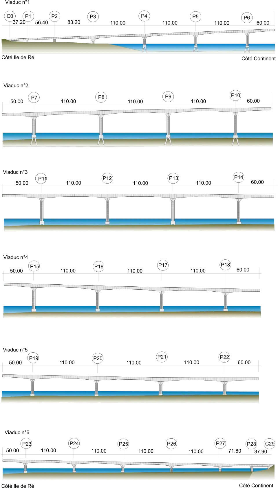 Le pont de l'Île de Ré est constitué de six viaducs distincts reliés entre eux par des joints de chaussée. L'ensemble de l'ouvrage présente un rayon de courbure horizontale de 5 000 mètres.