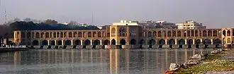 Le pont Khadjou à Ispahan est un pont remarquable d’Iran. Construit vers 1667, il comporte 18 voûtes en arcs pointus, et supporte une route de 26 mètres de largeur et comporte des couloirs ombragés. Il est aussi flanqué de pavillons et de tours de garde. Alliant architecture et technique dans une merveilleuse harmonie fonctionnelle, ce superbe pont servit aussi de barrage[18].