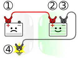 Une connexion temporaire est établie à la batterie d'un autre véhicule ou à une autre source d'alimentation externe. L'alimentation externe en électricité recharge la batterie du véhicule en panne et fournit une partie de la puissance nécessaire pour démarrer le moteur. Une fois le véhicule démarré, son système de charge normal prend le relai, de sorte que la source auxiliaire peut être supprimée. Si le système de charge du véhicule est fonctionnel, le fonctionnement normal du véhicule rétablira la charge de la batterie[1].