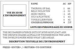 Lors des phases d'exploration, l'environnement s'affiche en trois dimensions avec un rectangle en haut à gauche de l'écran qui affiche ce que voit le groupe, le reste de l'écran étant occupé par des informations textuelles concernant le groupe et la zone explorée[15]. Le joueur peut accéder à des menus pour donner des ordres à ses personnages : utiliser, échanger, acheter ou vendre un objet, parlementer avec un ennemi, et apprendre ou lancer un sort. Il peut observer les déplacements des personnages selon différents angles, incluant une vue aérienne[16]. Le jeu utilise trois versions de chaque sprite pour indiquer la différence de distance qui sépare le groupe des prochaines rencontres[2].