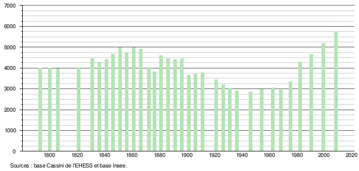 - ↑ Par convention dans Wikipédia, le principe a été retenu de n’afficher dans le tableau des recensements et le graphique, pour les populations légales postérieures à 1999, que les populations correspondant à une enquête exhaustive de recensement pour les communes de moins de 10 000 habitants, et que les populations des années 2006, 2011, 2016, etc. pour les communes de plus de 10 000 habitants, ainsi que la dernière population légale publiée par l’Insee pour l'ensemble des communes.