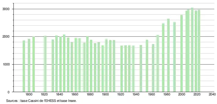 L'évolution du nombre d'habitants est connue à travers les recensements de la population effectués dans la commune depuis 1793. Pour les communes de moins de 10 000 habitants, une enquête de recensement portant sur toute la population est réalisée tous les cinq ans, les populations de référence des années intermédiaires étant quant à elles estimées par interpolation ou extrapolation[24]. Pour la commune, le premier recensement exhaustif entrant dans le cadre du nouveau dispositif a été réalisé en 2008[25].