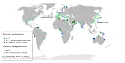 53 terminaux méthaniers sont en 2008 actifs dans le monde, dont 1 en Belgique (Port de Zeebrugge) 3 en France (Montoir-de-Bretagne et 2 à Fos-sur-Mer, avec 4 projets de port méthanier en cours d'étude ou de construction dans ce pays, à Dunkerque au Havre et deux à Bordeaux). En 2023, un terminal méthanier flottant démarre son exploitation au Havre.
