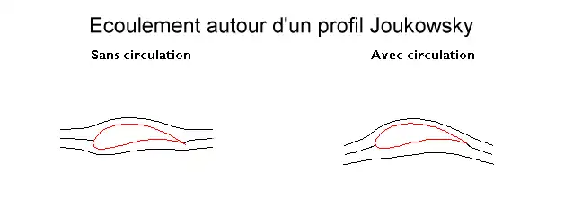 Par une transformation conforme (qui conserve les angles), on peut transformer le cylindre à section circulaire en une aile de profil constant. Le théorème précédent est toujours valable mais le problème physique concerne l'origine de la circulation. En effet, il est hors de question de faire tourner l'aile pour obtenir un effet Magnus.