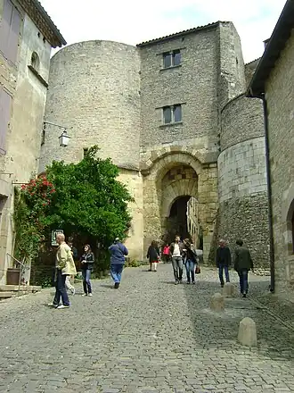 La porte est rainurée deux fois, signalant une double herse, triplée par une porte en bois. Elle est encadrée de deux tours. Celle de droite en sortant a deux étages, celle de gauche est arasée au niveau de la voute de la porte et sert de terrasse[1].