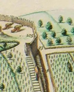 Face à la rue Saint-Léonard, un bastion armé de canons se situait dans l'envasement actuel du début de la rue Saint-Léonard et contrairement aux vues de Liège d'Aegide Marischal en 1618[6], de Julius Milheuser en 1627[7] et la gravure de Mérian vers 1650[8], le bâti était oblique, permettant de dissimuler, au premier abord l'entrée de la ville à tout qui venait de l'extérieur.