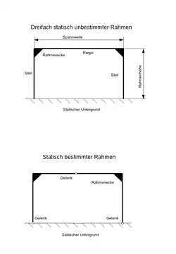 Dans le cas standard, un portique a une élévation quadrilatère et est constitué de deux barres de portique verticales ( poteaux ) et d'une barre horizontale. Les barres peuvent être encastrées en pied (photo du haut) ou montées de manière articulée (simplement un portique à deux articulations statiquement indéterminé ). Selon la conception, les coins du portique peuvent être supposés rigides, flexibles ou articulés. Plusieurs portiques peuvent être assemblés pour former une structure plus complexe, similaire à un système réticulé . Avec une structure de plancher (portique au sol), plusieurs portiques uniformes sont superposés.