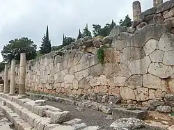 Colonnes ioniques et stylobate de la stoa, devant le mur polygonal du temple d'Apollon. | ||