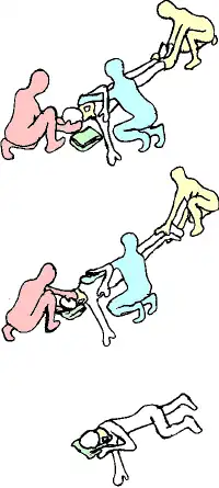 - les deux autres secouristes se disposent sur le côté du patient, le plus fort des deux au torse, le second aux jambes ; ces deux secouristes croisent leurs mains (voir figure) afin d'assurer une uniformité optimale de la poussée, et ainsi un maintien de la colonne vertébrale dans son alignement ;