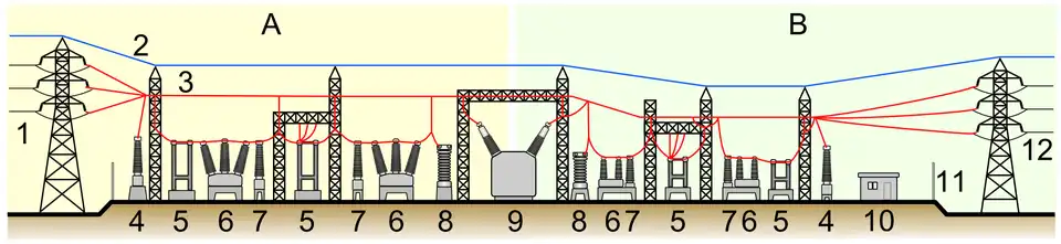 1. Ligne électrique primaire 2. Câble de garde 3. Ligne électrique 4. Transformateur de tension 5. Sectionneur 6. Disjoncteur 7. Transformateur de courant 8. Parafoudre 9. Transformateur (de puissance) 10. Bâtiment secondaire 11. Clôture 12. Ligne électrique secondaire)