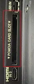 - Le connecteur PCMCIA. Un connecteur PCMCIA (de l'anglais personal computer memory card international association ) est un emplacement permettant de recevoir une carte décodeur TV au standard CI+, pour les chaines cryptées (aussi bien les chaines payantes que pour le bouquet gratuit-crypté Fransat de la Télévision Numérique par Satellite). Par rapport au tuner ou décodeur extérieur, cette solution a deux avantages : il n’y a pas d’appareil supplémentaire extérieur (et pas de câbles) et le contrôle des chaines est simplifié. La télécommande du téléviseur est utilisée au lieu d’être obligé d’utiliser une télécommande supplémentaire[24]. Ces cartes ont les mêmes dimensions que les cartes de crédit 85,60 × 53,98 mm. Bien que seulement la moitié de la carte entre dans le connecteur, ceci représente une trop grande longueur pour être implanté au dos du téléviseur. De ce fait, ces connecteurs sont installés verticalement sur le côté de l’équipement.
