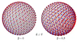 Sur les illustrations ci-contre, on observe le résultat d'un événement qui a eu lieu au centre de la sphère à une distance . Durant ce temps , la particule continue son mouvement et n'est donc plus forcement au centre de la sphère au moment de l'observation. Pour les champs engendrés par une accélération non nulle, on remarquera la symétrie axiale du champ par rapport au vecteur accélération lorsque puis la concentration des radiations dans la direction de la trajectoire lorsque [1].