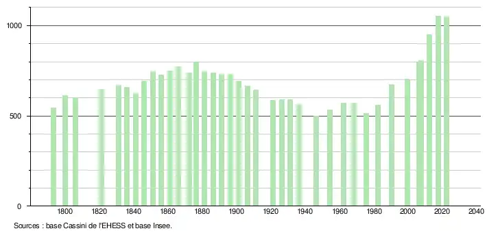 L'évolution du nombre d'habitants est connue à travers les recensements de la population effectués dans la commune depuis 1793. Pour les communes de moins de 10 000 habitants, une enquête de recensement portant sur toute la population est réalisée tous les cinq ans, les populations de référence des années intermédiaires étant quant à elles estimées par interpolation ou extrapolation[19]. Pour la commune, le premier recensement exhaustif entrant dans le cadre du nouveau dispositif a été réalisé en 2007[20].