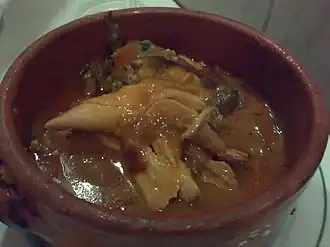 Le poulet moambe (muamba de galinha en portugais) est un plat traditionnel angolais parmi les plus populaires. Il est fait avec de l'huile de palme (préparée d'une façon particulière appelée moamba, qui donne son nom au plat), de la noix de cola, de la malaguette (jindungo, différente de la malaguette d'Afrique de l'Ouest), de l'oignon, des courges et de l'ail.