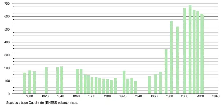 L'évolution du nombre d'habitants est connue à travers les recensements de la population effectués dans la commune depuis 1793. Pour les communes de moins de 10 000 habitants, une enquête de recensement portant sur toute la population est réalisée tous les cinq ans, les populations de référence des années intermédiaires étant quant à elles estimées par interpolation ou extrapolation[16]. Pour la commune, le premier recensement exhaustif entrant dans le cadre du nouveau dispositif a été réalisé en 2006[17].