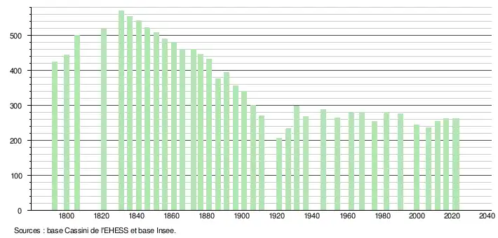 L'évolution du nombre d'habitants est connue à travers les recensements de la population effectués dans la commune depuis 1793. Pour les communes de moins de 10 000 habitants, une enquête de recensement portant sur toute la population est réalisée tous les cinq ans, les populations de référence des années intermédiaires étant quant à elles estimées par interpolation ou extrapolation[22]. Pour la commune, le premier recensement exhaustif entrant dans le cadre du nouveau dispositif a été réalisé en 2006[23].