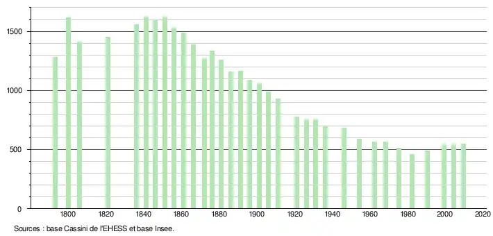 L'évolution du nombre d'habitants est connue à travers les recensements de la population effectués dans la commune depuis 1793. À partir du , les populations légales des communes sont publiées annuellement dans le cadre d'un recensement qui repose désormais sur une collecte d'information annuelle, concernant successivement tous les territoires communaux au cours d'une période de cinq ans. Pour les communes de moins de 10 000 habitants, une enquête de recensement portant sur toute la population est réalisée tous les cinq ans, les populations légales des années intermédiaires étant quant à elles estimées par interpolation ou extrapolation[6]. Pour la commune, le premier recensement exhaustif entrant dans le cadre du nouveau dispositif a été réalisé en 2004[7],[Note 2].