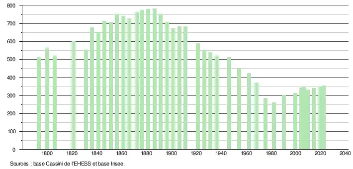 L'évolution du nombre d'habitants est connue à travers les recensements de la population effectués dans la commune depuis 1793. Pour les communes de moins de 10 000 habitants, une enquête de recensement portant sur toute la population est réalisée tous les cinq ans, les populations de référence des années intermédiaires étant quant à elles estimées par interpolation ou extrapolation[23]. Pour la commune, le premier recensement exhaustif entrant dans le cadre du nouveau dispositif a été réalisé en 2004[24].
