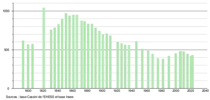 L'évolution du nombre d'habitants est connue à travers les recensements de la population effectués dans la commune depuis 1793. Pour les communes de moins de 10 000 habitants, une enquête de recensement portant sur toute la population est réalisée tous les cinq ans, les populations de référence des années intermédiaires étant quant à elles estimées par interpolation ou extrapolation[22]. Pour la commune, le premier recensement exhaustif entrant dans le cadre du nouveau dispositif a été réalisé en 2005[23].