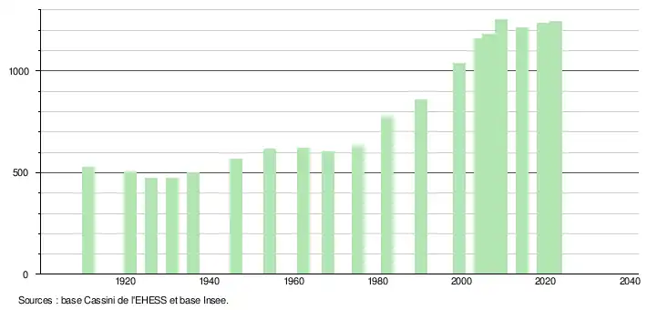 L'évolution du nombre d'habitants est connue à travers les recensements de la population effectués dans la commune depuis 1911. Pour les communes de moins de 10 000 habitants, une enquête de recensement portant sur toute la population est réalisée tous les cinq ans, les populations de référence des années intermédiaires étant quant à elles estimées par interpolation ou extrapolation[20]. Pour la commune, le premier recensement exhaustif entrant dans le cadre du nouveau dispositif a été réalisé en 2004[21].
