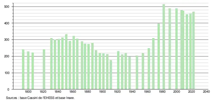 L'évolution du nombre d'habitants est connue à travers les recensements de la population effectués dans la commune depuis 1793. Pour les communes de moins de 10 000 habitants, une enquête de recensement portant sur toute la population est réalisée tous les cinq ans, les populations de référence des années intermédiaires étant quant à elles estimées par interpolation ou extrapolation[15]. Pour la commune, le premier recensement exhaustif entrant dans le cadre du nouveau dispositif a été réalisé en 2008[16].